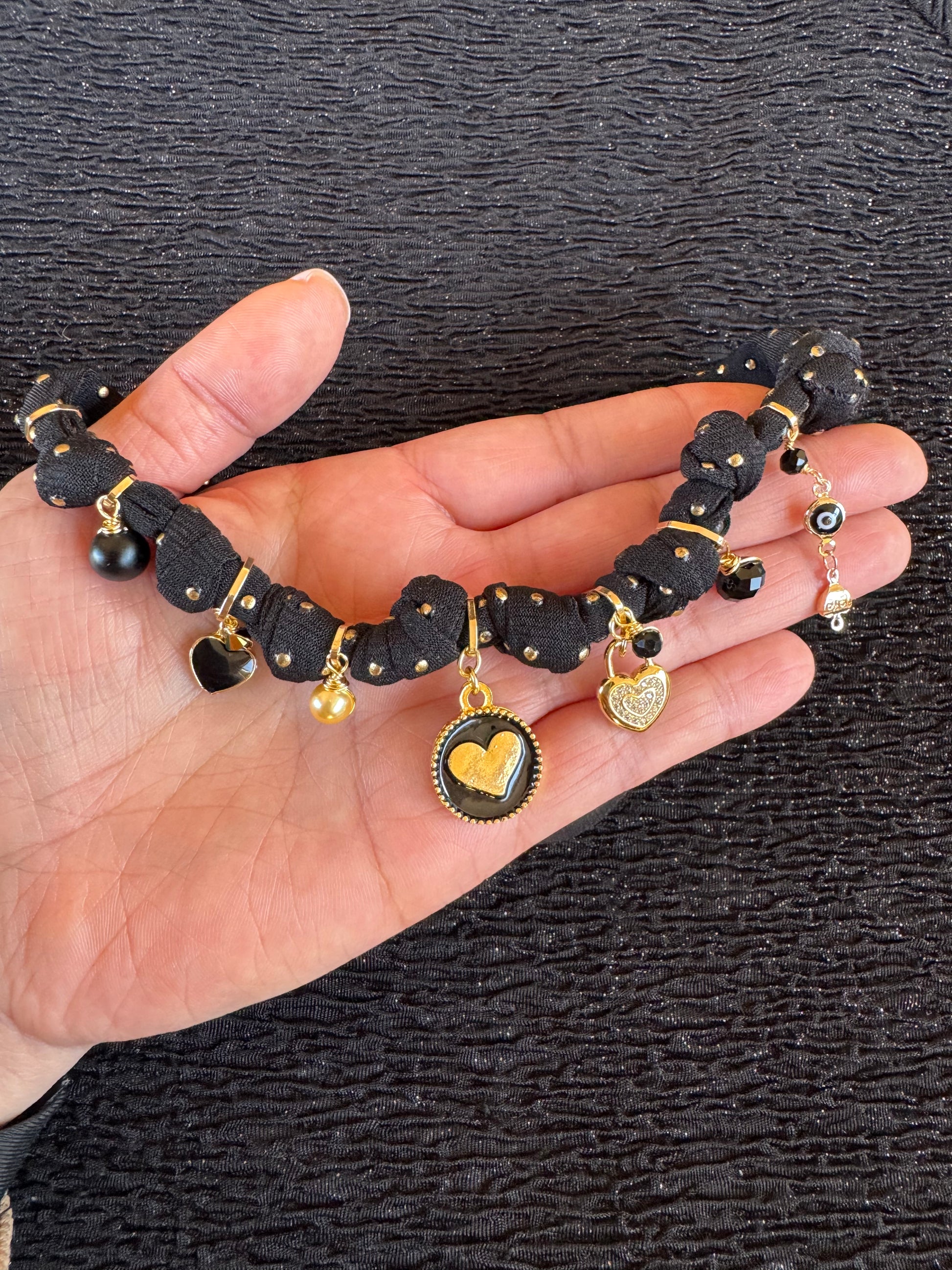 Material: Tela con dijes bañados en oro de 24 y 18 kilates, piedras y cristales originales.