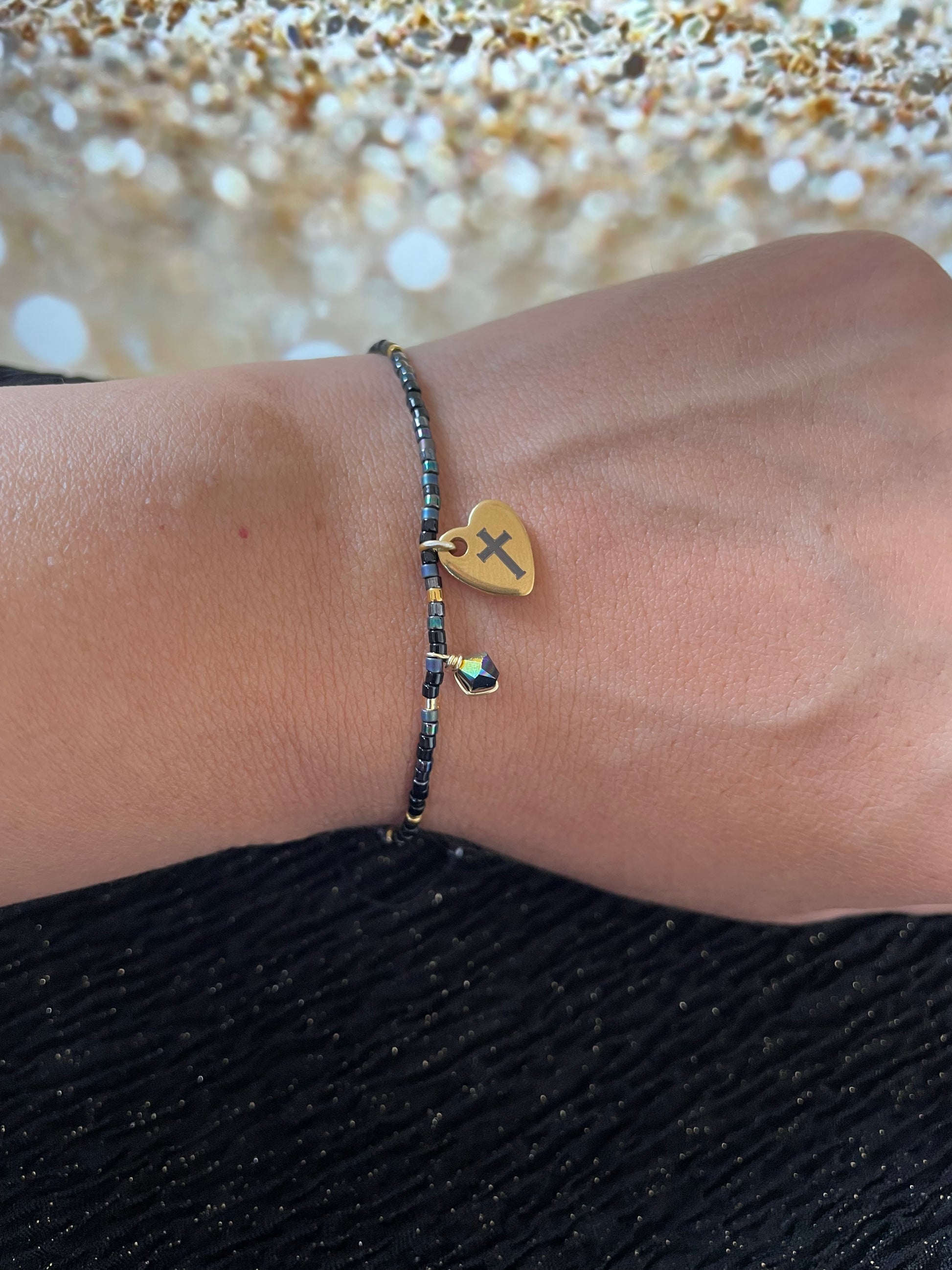 Material: Delicas miyuki, cristal original, dije acero inoxidable terminación espejo con grabado láser.