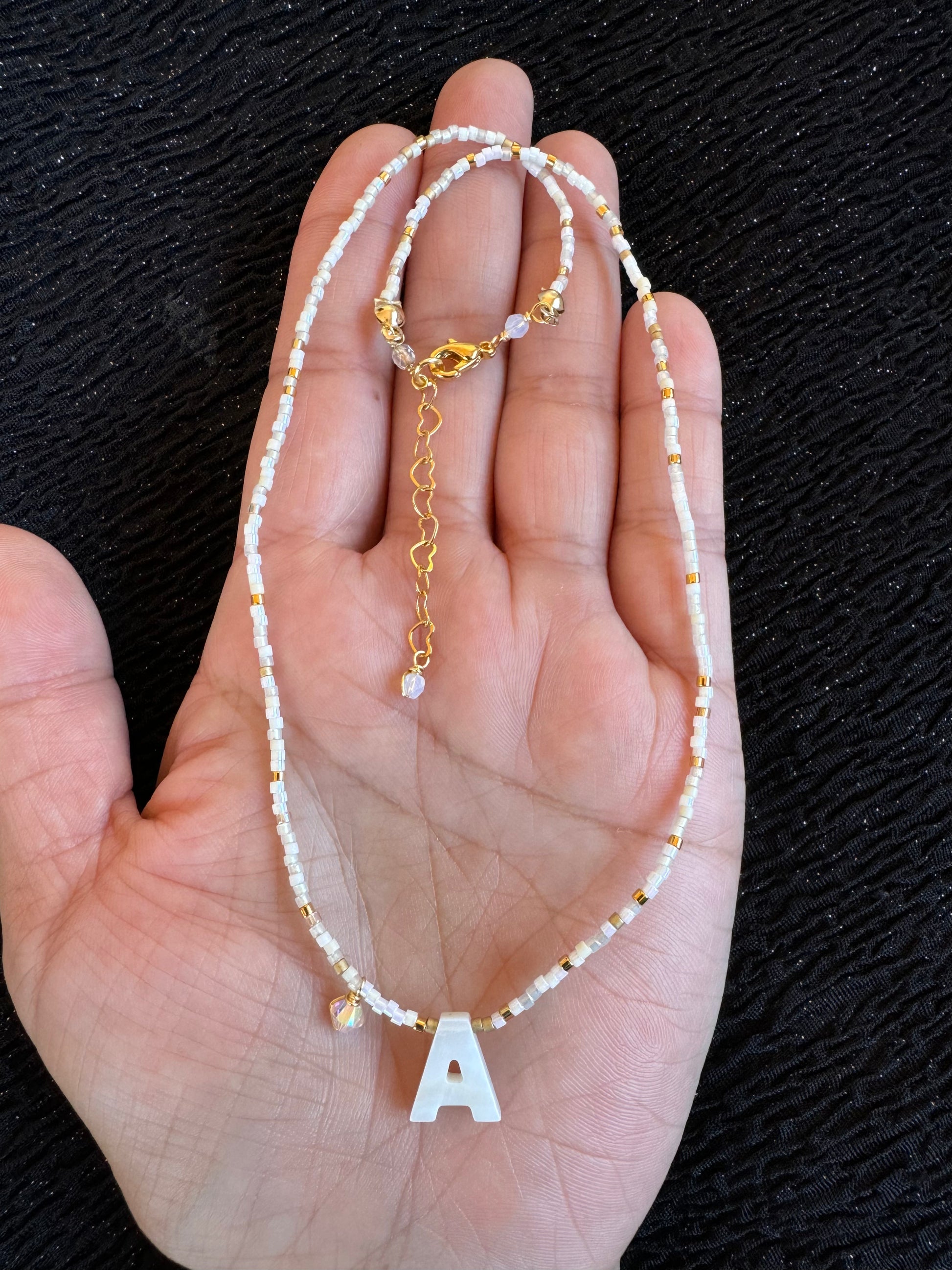 Material: Delicas miyuki, letra nácar, punto de luz cristal original, baño en oro 18 kilates.